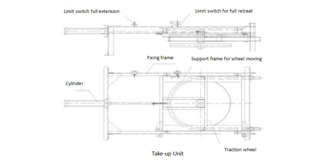 Tension station adopts cylinder take-up unit. At the end of it equipped with a detection switch that can display chain slack, chain jamming, and chain fracture faults. The tension and expansion part is installed on a rigid frame with a walking wheel and a guide wheel for precise guidance. Considering the load should be equally spaced, an inlet guide slot is set on the track. Under take-up unit there is an inspection platform. The track connection at the enter of tension unit should be threaded or movable for convenient maintenance and disassembly of the chain. Take-up unit is used to keep the power chain with certain initial tension force. The cylinder and air pneumatic unit is from SMC of Japan.